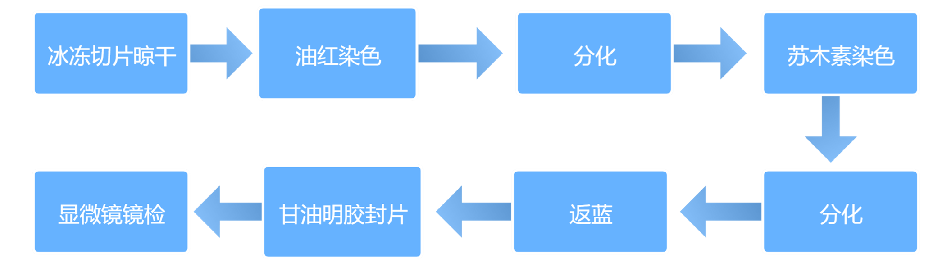技术原理油红O对脂滴的染色机制一般认为是物理学上的溶液作用或吸附作用,借溶液作用使脂质染色,即油红O先溶于60%异丙醇中,然后切片浸入油红O染液中时,油红O在组织脂质的溶解度较60%异丙醇中的溶解度高,所以在染色时油红O从60%异丙醇中转移入脂质中使脂滴显示红色。实验流程实验结果展示:<油红O-肝>送样运
