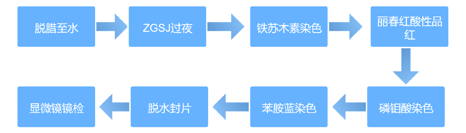 丽春红酸性品红-苯胺蓝染色,是用于检测动物组织中胶原纤维的一种染色方法之一,能够将胶原纤维染成蓝色,肌纤维、和红细胞呈红色,可用于鉴胶原纤维和肌纤维;并显示各种组织胶原纤维含量及纤维化程度。